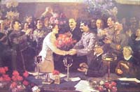 Еще один очень даже достойный образец соцреализма, посвящённый майским демонстрациям трудящихся в Москве. Авторы и точное название пока не опознаны.